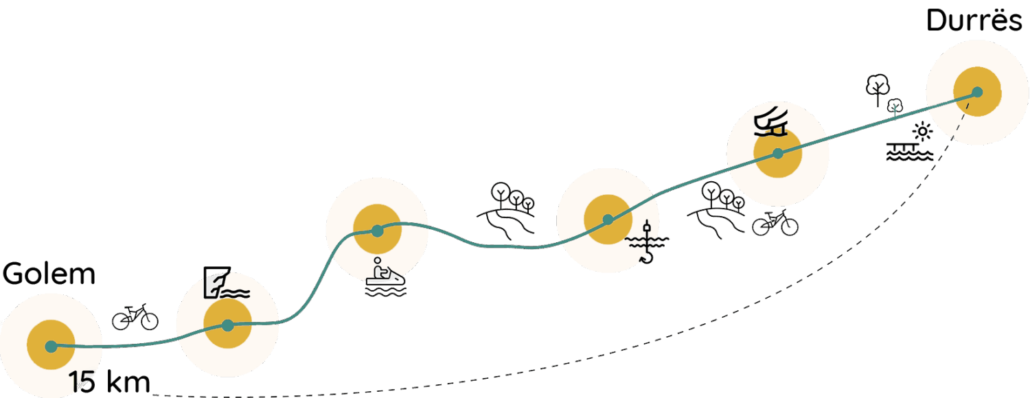 - Tirana – stolica oddalona o około 40 km, z placem Skanderbega, Muzeum Historycznym, meczetem Ethema Beja i kolejką linową Dajti Ekspres.